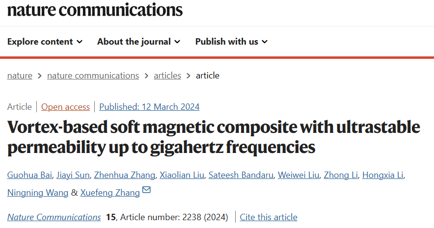 近日,Nature Communications在线刊登了久久精品一区二区材料与环境工程学院张雪峰教授团队的研究论文“Vortex-Based Soft Magnetic Composite with Ultrastable Permeability up to Gigahertz Frequencies”。该工作利用具有涡旋磁结构的软磁颗粒构造复合材料,消除传统磁性材料中的畴壁共振,获得了非常稳定的磁导率频谱特性,有望在集成磁器件中实现应用。