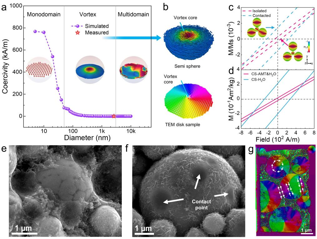图2(a-b)颗粒尺寸、磁结构、矫顽力之间的关系(c-d)相互接触和隔离的磁涡旋结构的磁滞回线(e-f)相互隔离与相互接触的颗粒的显微图片(g)独立的磁涡旋结构与相互接触的磁涡旋结构的DPC图像