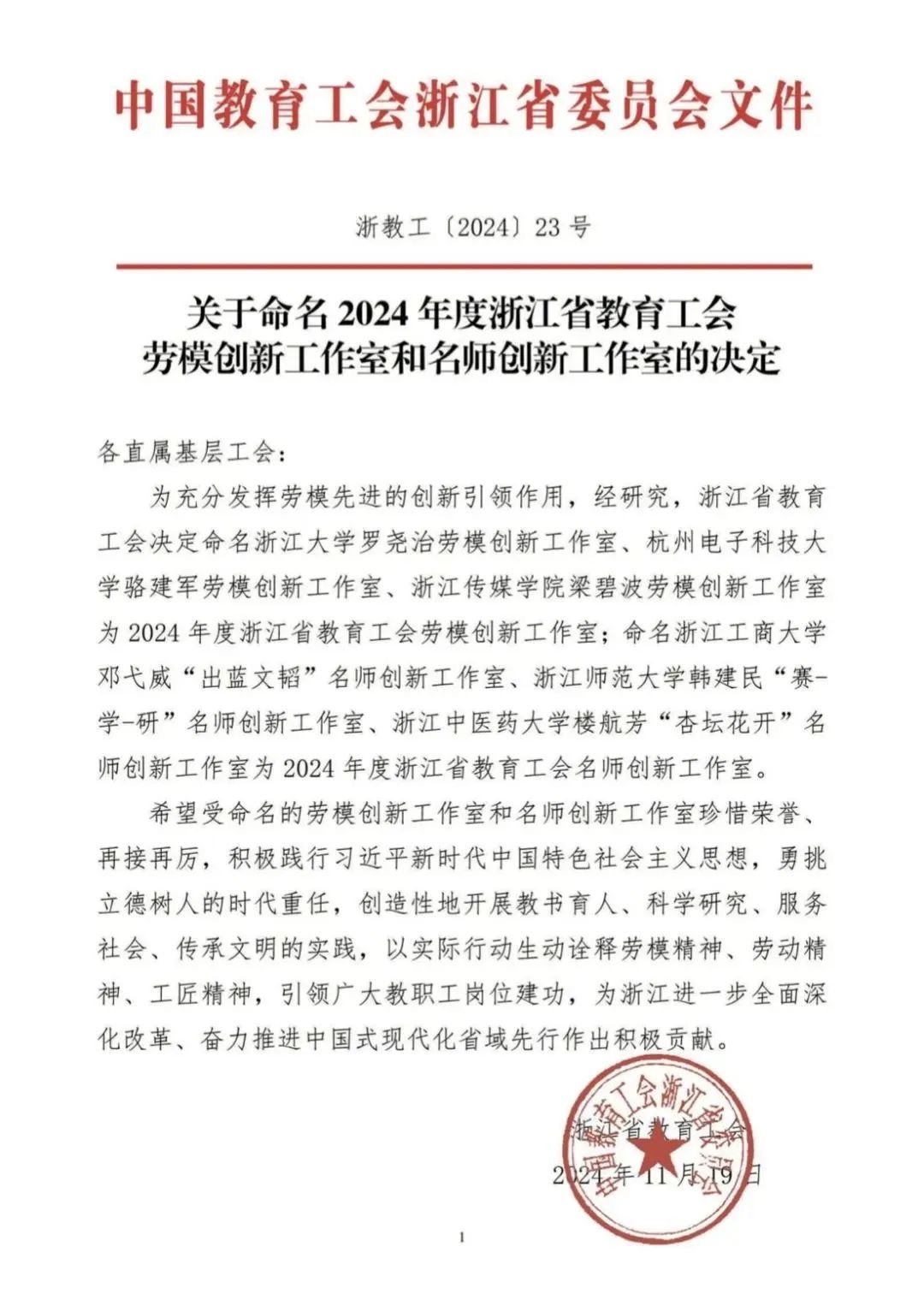 近日,浙江省教育工会下发《关于命名2024年度浙江省教育工会劳模创新工作室和名师创新工作室的决定》,我校骆建军劳模创新工作室获命名,全省仅3家,这也是我校首次获得该项荣誉。