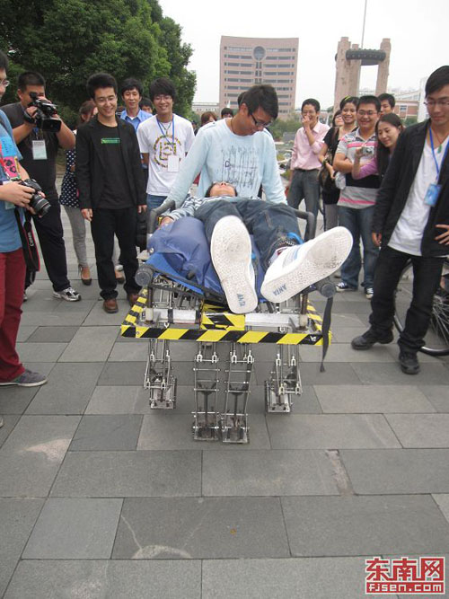 上图为杭州科技电子大学的学生发明的“有腿的担架”,这种担架因为“有腿”所以只需要一个人扶着就能前进了。