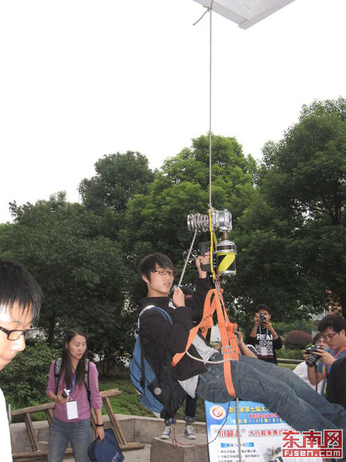 上图为杭州科技电子大学的学生发明的升降机,挂在上面的人可以通过一条绳子(图中演示人员手里抓的绳子)自己操作升降机,主要用于紧急抢救。