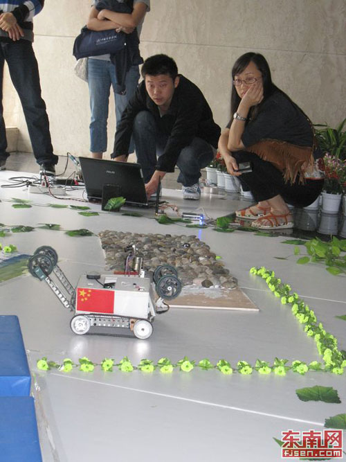 杭州科技电子大学的“搜救之星”在第五届全国大学生智能汽车竞赛中获得创意赛二等奖。图为参与制作的学生演示“搜救之星”如何攻破一道道“关卡”,顺利穿越障碍物。