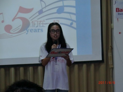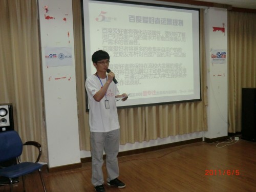 百度爱好者五周年庆典于6月5日下午18:30正式开始,在主持人介绍完到场嘉宾之后,大屏幕上开始播放来自团队内外的对百度爱好者网站的祝福之声。爱度杭电团前任队长余笃权带大家一起回顾了百度爱好者五年来的发展历程,现任队长陈斌介绍了现阶段爱度杭电团队的主要成员并表达了对百度爱好者网站五周年的深深祝福。