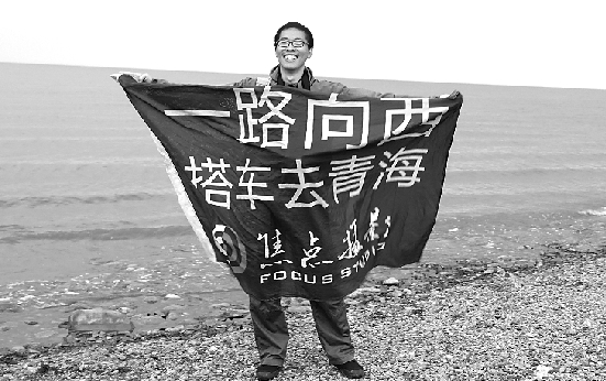 肖磊特别喜欢摄影,是学校摄影社团的小头目。“最开始,我是想多拍些风土人情,才决定搭车去旅行的。”肖磊说,“从计划到出发用了半个月时间,设计搭车线路、搭车注意事项,买了背包、帐篷,然后做了一面和我人一样高的搭车大旗,写着‘一路向西,搭车去青海’,就出发了。”