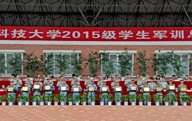 军训师师长冯军宣读本次军训的嘉奖令。14个方阵获得队列优胜奖,7个方阵获得表演方阵优秀奖,14个连队获得宣传工作奖,62个寝室获得内务优胜奖,3个营队被评为最美军训营。另有124名军训先进个人、15名优秀教官、10名优秀政工干部也受到表彰。