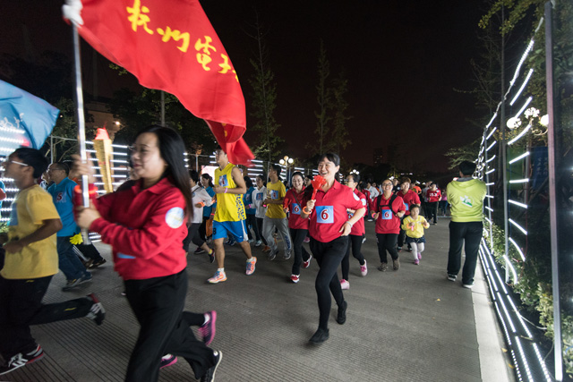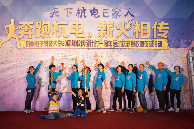 启动仪式后,在校领导的带领下,由60名教职工、校友代表组成的“领跑团”和近千名师生组成的“助跑团”和“乐跑团”兴致勃勃地参加了校园夜跑活动。大家戴着颜色各异的荧光手环,高喊着“加油杭电”、“我爱杭电”的口号,一起传递校旗与火 炬,进行环校60公里接力跑。60公里接力跑,既是为学校60华诞加油助跑,也寓意着传承学校60年的优良传统,传承学校60年来所凝练的大学精神,再现学校60年的风雨兼程,薪火相传、奔跑向前。