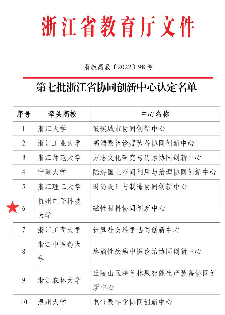 日前,浙江省教育厅公布了第七批浙江省协同创新中心认定结果,我校材料与环境工程学院报送的磁性材料协同创新中心成功获批。