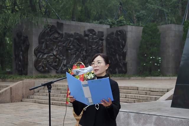 云居山麓,青松挺立、翠柏环抱,上午9时许,在巍然耸立的烈士纪念碑前,全体党员干部佩戴党员徽章,手持菊花,神情肃穆。