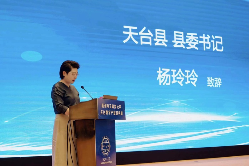 杨玲玲代表天台县委、县政府对研究院的揭牌表示热烈祝贺。她表示,天台与杭电深度联手,合作共建数字产业研究院,致力于构建政校企一体的创新生态。期待校方院方发挥数字经济、智能制造等领域的学科和智力优势,打造技术创新攻关、项目孵化转化、人才交流引育、助力共同富裕“四个平台”,带动更多优质资源投向天台。希望天台企业搭上研究院的“科创快车”,借智借脑借力,加速裂变发展。天台县委县政府将拿出最大诚意,尽最大努力,打造一流的科创生态,为校地互动、院企合作提供最优服务、最强保障,共同赋能天台跨越式高质量发展。