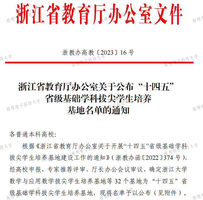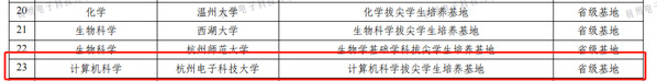 根据《浙江省教育厅办公室关于公布“十四五”省级基础学科拔尖学生培养基地名单的通知》(浙教办高教〔2023〕16 号)公布信息,我校计算机科学拔尖学生培养基地获批“十四五”省级基础学科拔尖学生培养基地。