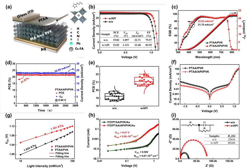 图 1. a) 电池结构示意图;b)最优器件J-V曲线;c) EQE测量;d) API处理后最优器件的稳态输出;e) API处理前后器件的PCE统计图;f) 暗态J-V;g) Voc的光强依赖性;h) SCLC测试;i) 阻抗谱图