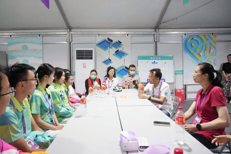 9月24日,杭州亚运会网球项目在杭州奥体中心网球中心开赛。当天下午,团中央青年志愿者行动指导中心党委书记张朝晖,团浙江省委书记周苏红,杭州亚组委志愿者部部长、杭州团市委书记汪杰一行来到场馆看望慰问正在志愿服务的赛会志愿者。