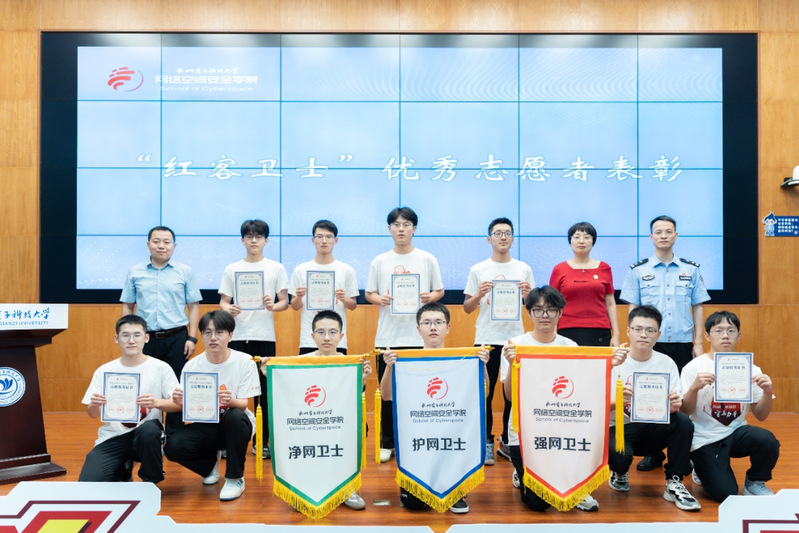 校党委副书记戚明钧为赛博协会指导老师王小军授“红客卫士”总队旗,钱塘区委宣传部常务副部长李安坤、钱塘区网警大队队长潘宏明、网络空间安全学院党委书记罗美华为红客卫士志愿者代表颁发志愿服务证书并为“净网卫士”“护网卫士”“强网卫士”授小队旗。