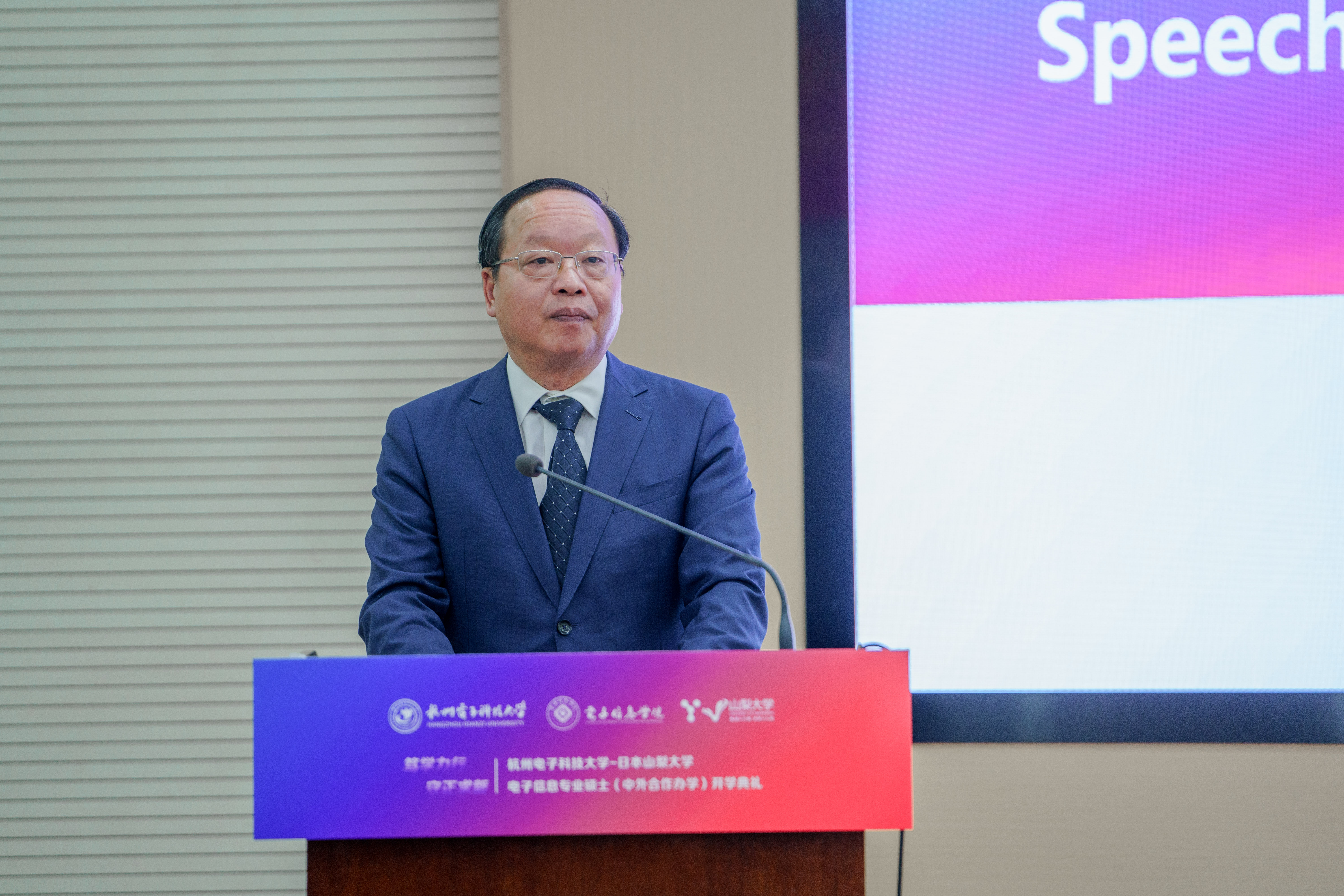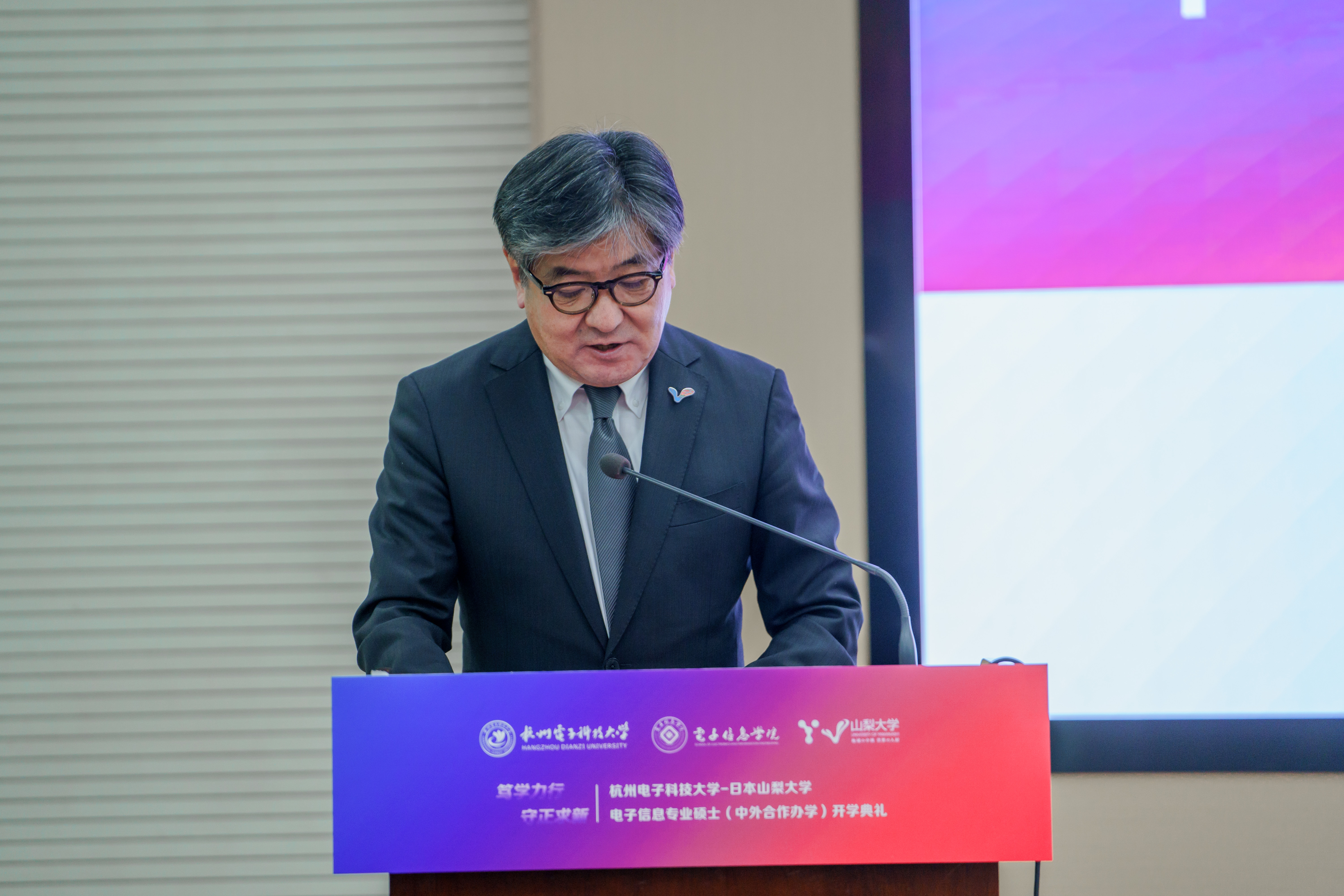朱泽飞首先致辞,对参加开学典礼的山梨大学领导表示热烈欢迎,他表示杭电与日本山梨大学有着悠久深厚的友谊,两校自2008年建立合作伙伴关系以来,在学生交流交换、联合培养、教师互访、科研合作等领域取得了一系列优秀合作成果,我校电子信息学院与山梨大学合作办学项目的获批标志着两校合作迎来了新的里程碑。朱泽飞对该项目的首批研究生提出了三点希望:一是戒骄戒躁、脚踏实地,中外合作办学项目是新的平台,也是新的挑战,希望同学们戒骄戒躁,脚踏实地,努力适应;二是主动创新、敢于突破,年轻一代当以主动创新敢于突破的姿态,创造人类社会美好的未来;三是提升格局、拓宽视野,希望同学们能够秉承家国情怀,国际视野,利用合作办学平台开拓眼界,提升自身的全球竞争力。