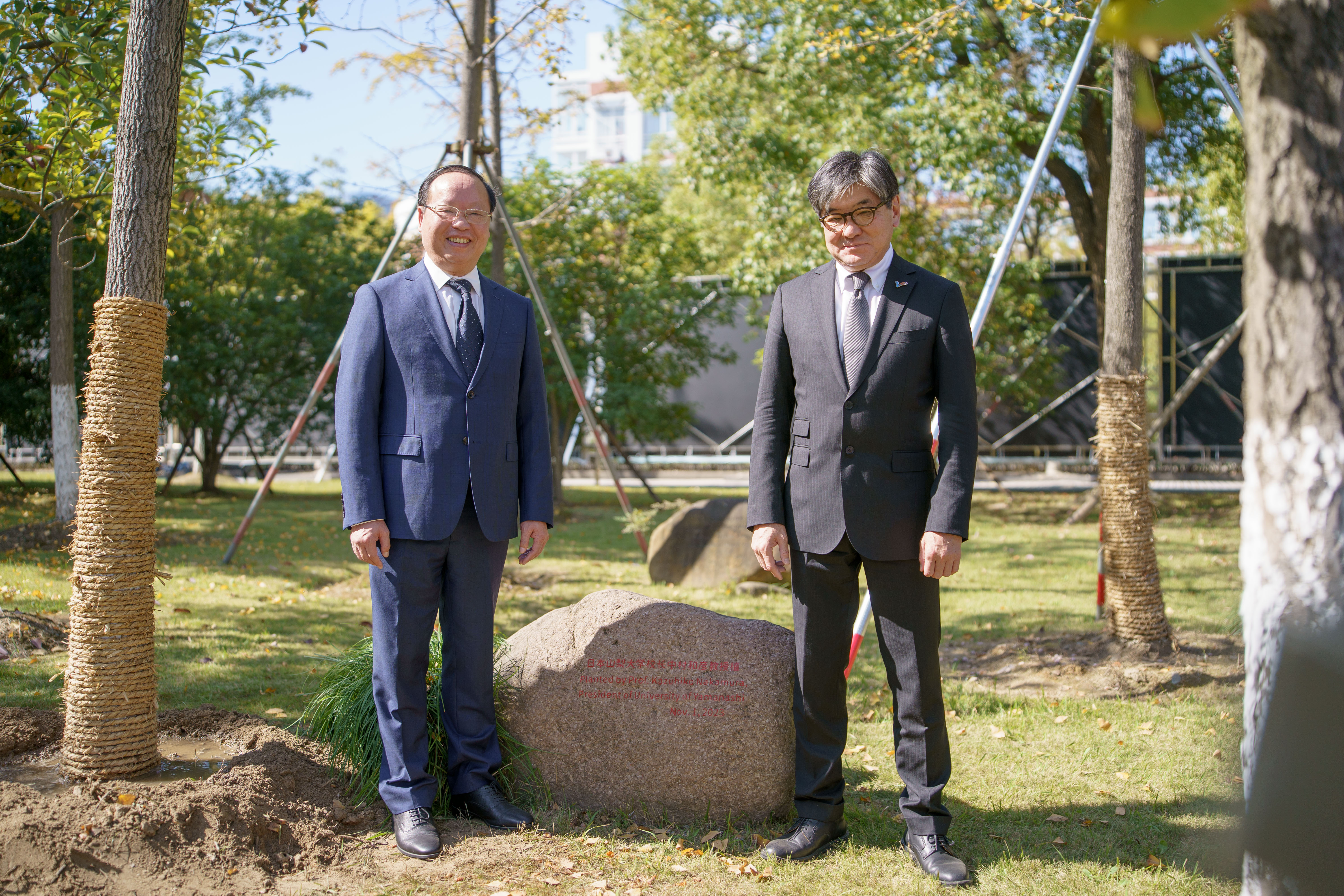 开学典礼结束后,朱泽飞和中村和彦一道在校园内种下友谊树,希望两校友谊像共同浇灌的这株树苗一样,向阳而生、茁壮成长。