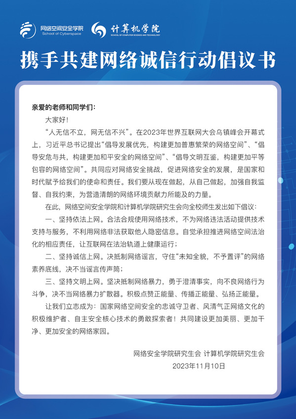 苏晶老师指出,学院去年举行了“正心诚信,你我同行” 网络诚信教育系列活动,今年我们希望更多的兄弟学院能够加入我们。在2023年世界互联网大会乌镇峰会开幕式上,习近平总书记提出“倡导发展优先,构建更加普惠繁荣的网络空间”、“倡导安危与共,构建更加和平安全的网络空间”、“倡导文明互鉴,构建更加平等包容的网络空间”。网络空间安全学院与计算机学院借研究生会联谊的契机,共话网络诚信,共同发起行动倡议书,是我们两个学院学生组织的一次交流合作,也是学院组织开展深入学习贯彻习近平总书记关于网络强国的重要思想,为共同营造健康文明的网络环境、构建清朗网络空间贡献青春力量的一种决心和表达。希望以后两个学院的学生组织可以发挥骨干作用,多交流、多合作。
