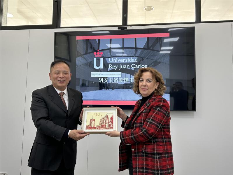 在西班牙胡安·卡洛斯国王大学,杨勇一行与主管国际化的副校长María Luisa Humanes女士、国际处负责人Pablo T. Salvadores Alonso以及中国事务办公室负责人Zhe Lin博士。双方讨论了续签合作协议的具体细节,并就进一步深化合作、增加师生互派、加强语言教学交流、管理学硕士联合培养等方面达成一致。