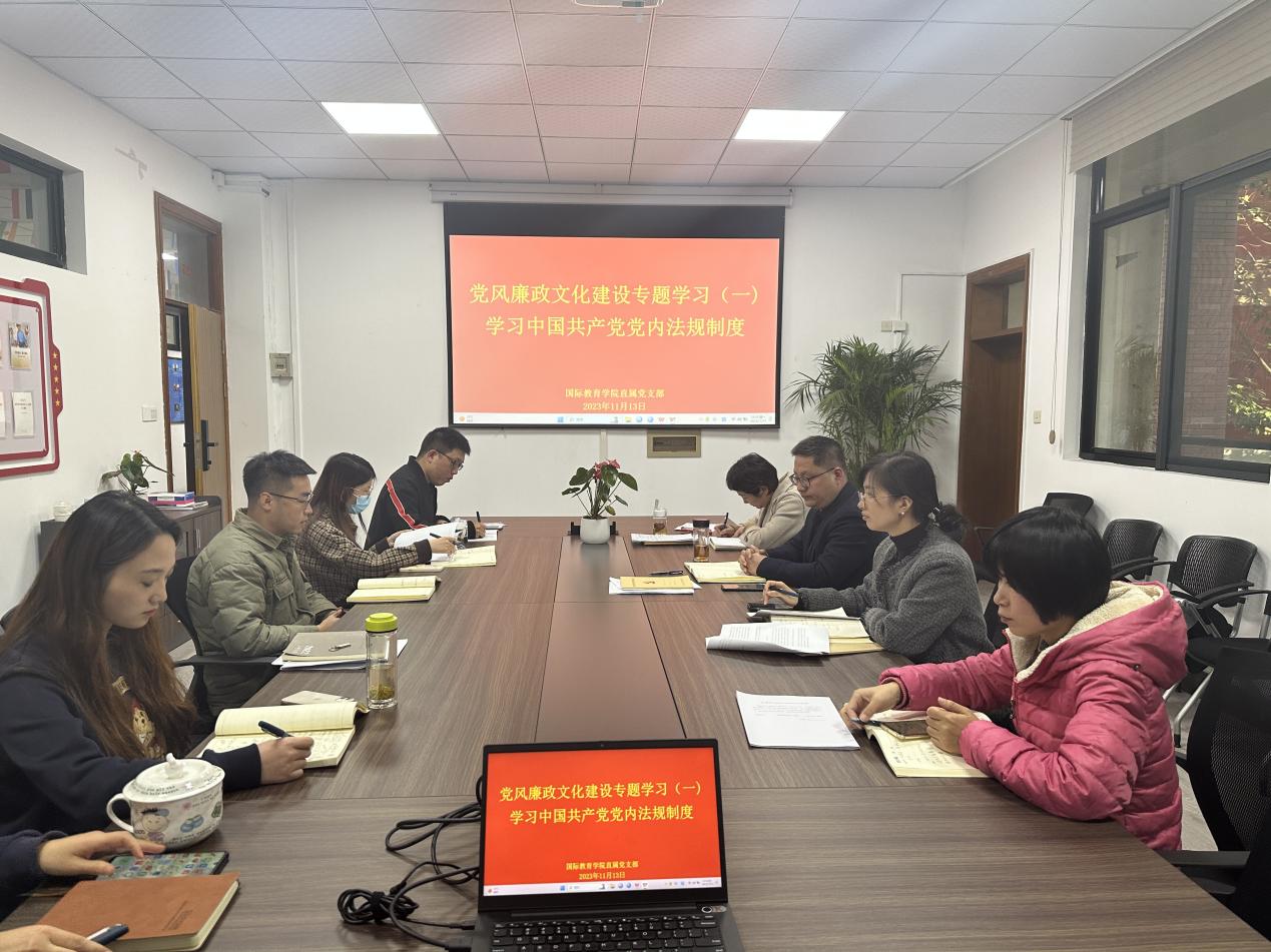 为落实全面从严治党要求,切实加强廉政教育,引导党员主动学廉、促廉、践廉,11月13日下午,国际教育学院直属党支部召开专题学习会,学习中国共产党党内法规制度。支部书记王一安主持会议,副院长许静领学,支部全体党员参加会议。