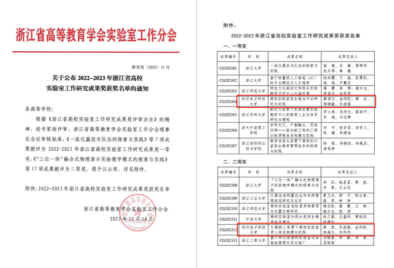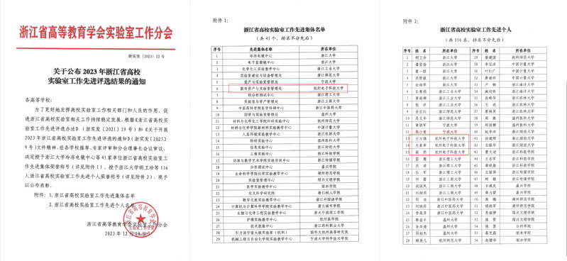 近日,浙江省高等教育学会实验室工作分会公布2023年浙江省高校实验室工作先进评选结果,我校“国有资产与实验室管理处”荣获“浙江省高校实验室工作先进集体”称号;机械工程学院王万强、理学院尤素萍和国有资产与实验室管理处高然三位老师荣获“浙江省高校实验室工作先进个人”称号。同期公布2022-2023年浙江省高校实验室工作研究成果奖获奖名单,我校组织参选的《高校实验室安全智治平台研究与实践》和《立德树人背景下高校实验室育人体系构建与实践》两项课题分获一、二等奖。浙江省高校实验室工作研究成果奖每两年评选一次,此次评选全省共评出一等奖7项,二等奖17项。