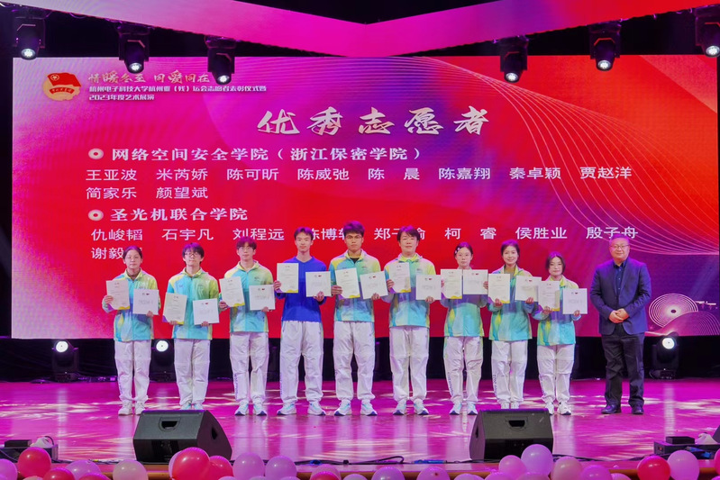 仪式上,校党委书记王兴杰为“第十四届中国青年志愿者优秀个人奖”获得者、杭电场馆群人事/志愿者领域志愿者、管理学院2021级本科生肖宇晴颁奖;副校长杨勇、副校长李文钧分别为我校杭州亚(残)运会杰出志愿者代表、优秀志愿者代表颁奖。仪式上,志愿者代表向志愿者领队教师献花致谢。