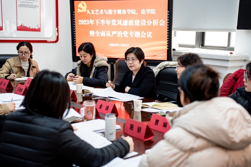 为进一步贯彻落实全面从严治党战略方针,推进党风廉政建设,巩固深化主题教育成果,根据学校统一部署,1月22日下午,人艺数法学院召开了2023年下半年党风廉政建设分析会暨全面从严治党专题会议。校党委委员、纪委书记任蔚青到会指导并作点评。学校办公室主任金涛,纪检监察室副主任王珺,学院党政领导班子成员、党委委员、纪委委员、党风党纪监督员、教师党支部书记参加,会议由学院党委书记冯瑛主持。