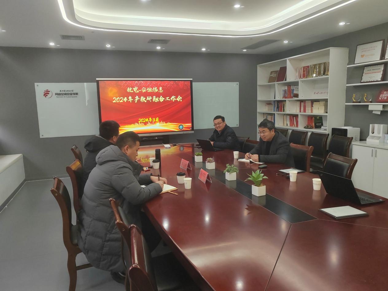 3月1日,网络空间安全学院与杭州安恒信息技术股份有限公司召开了2024年度产教研融合工作会,致力于进一步深化网络空间安全产教融合,推进协同育人。学院院长赵治栋、副院长任一支、院长助理袁理锋、副教授王浩,安恒信息高级副总裁苗春雨、副总裁吴鸣旦出席会议。