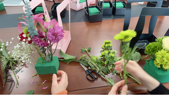 活动现场花香满屋,惊喜不断。花艺老师分享了花艺美学,介绍了花的品种、花语、色彩搭配,讲解了插花的基本技巧。外院女神们心灵手巧,品味不凡,手中作品各有千秋。大家互相欣赏,互相赞赏,真是心中锦绣意,婉转现旖旎。