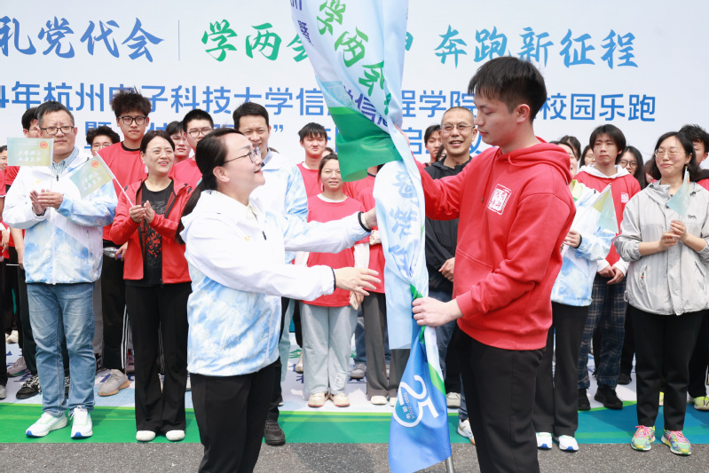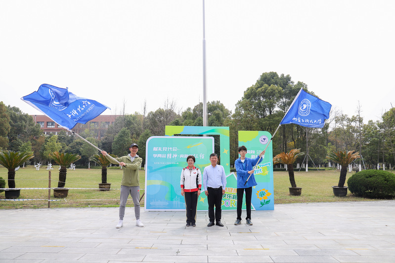 钱波、任蔚青、周青分别在青山湖及下沙校区向教职工和学生代表授旗,旗帜飘扬,象征健康与活力的传递,体育强国精神的弘扬。