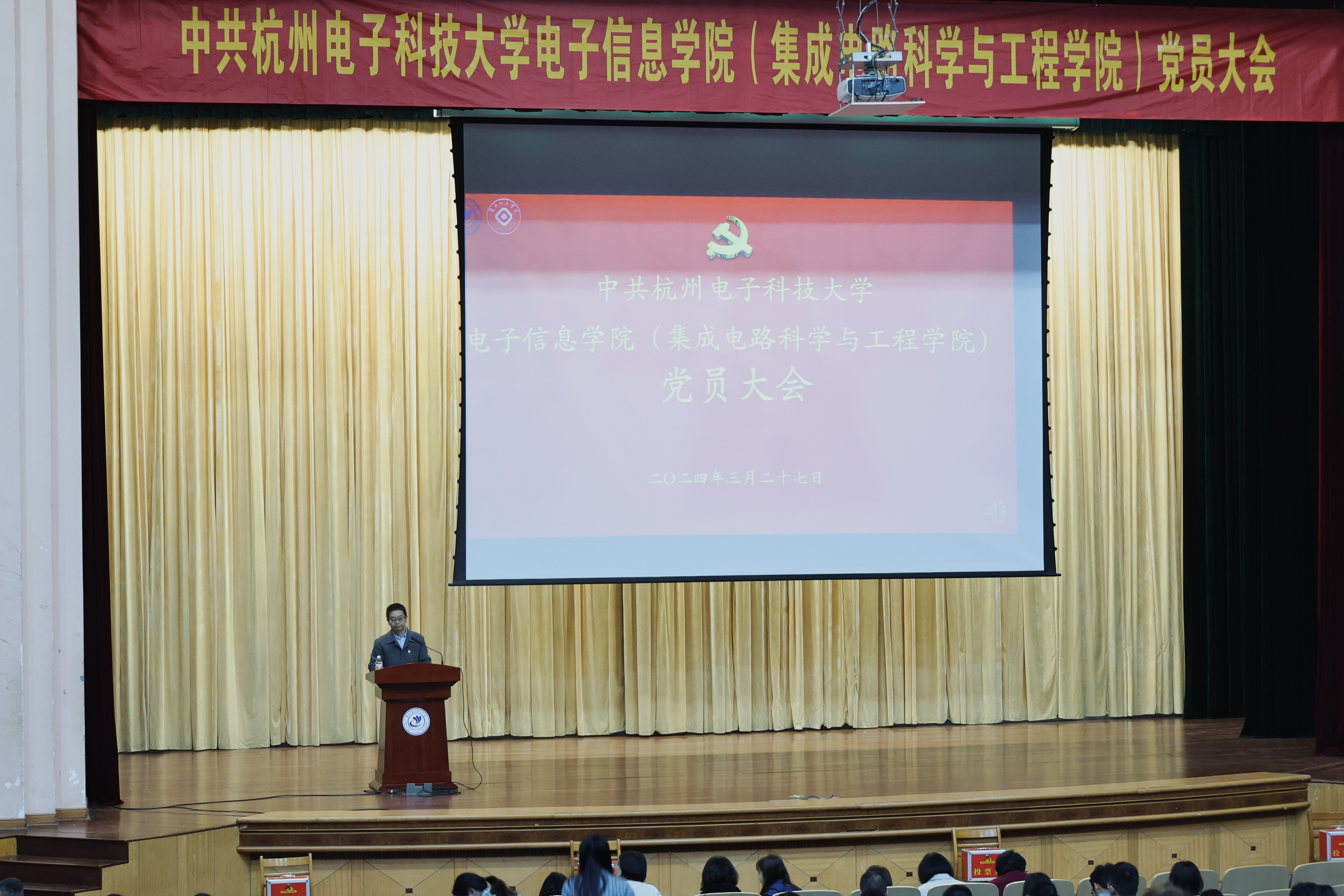 3月27日下午,电子信息学院党委在学生活动中心剧院召开党员大会,选举产生出席学校第四次党代会代表。学院党政领导班子、师生党员共522人出席会议,本次大会由学院党委副书记章宗森主持。
