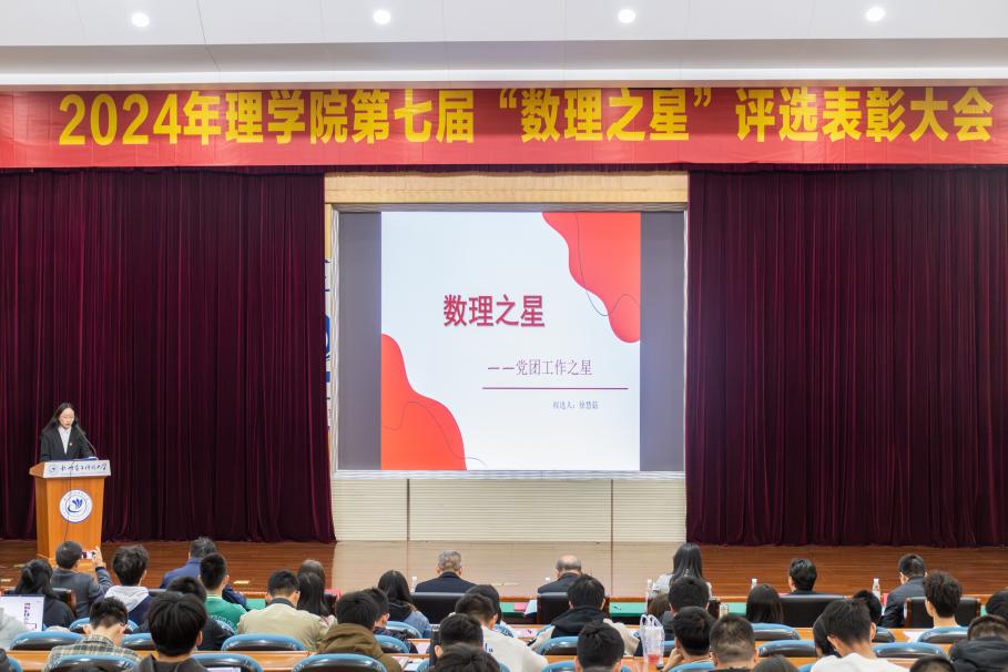 为促进理学院学风建设,表彰在各个领域表现杰出的学生典型,宣传先进事迹,发挥优秀大学生的榜样引领作用,3月27日下午,理学院第七届“数理之星”评选表彰大会在科技馆报告厅成功举办,理学院党政领导班子、各专业负责人、辅导员代表到会并担任评委,全院学生现场观看。