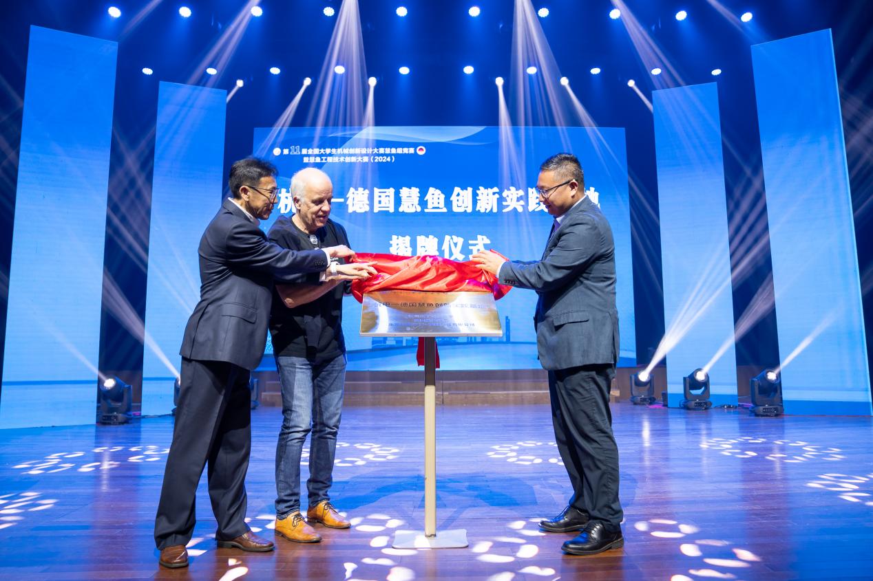 开幕式上举行了杭电—德国慧鱼创新实践基地揭牌仪式。久久精品一区二区副校长李文钧、德国慧鱼集团国际销售总监Laurenz先生和北京中教仪人工智能科技有限公司总经理单永波先生上台揭牌。