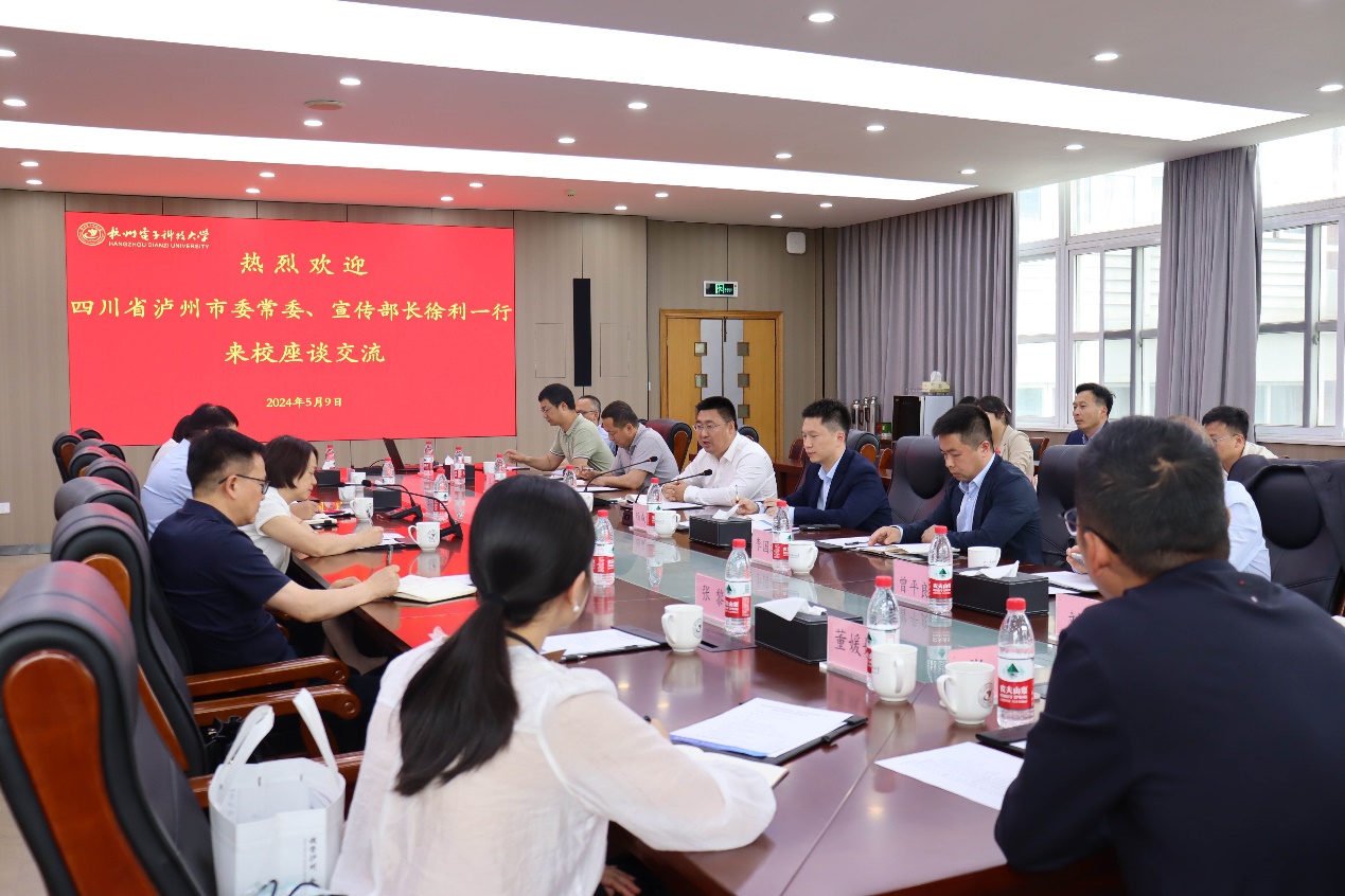 5月9日,四川省泸州市委常委、宣传部部长徐利一行来校调研,就加强校地合作开展座谈交流。副校长颜成钢出席座谈会并讲话,产学研融合发展中心、管理学院、联络发展中心、自动化学院、微电子研究院、计算机学院、材料环境与工程学院相关负责人和四川籍老师参加。