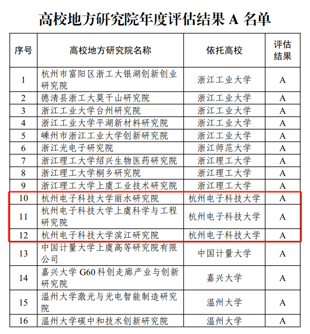 近日,省教育厅省属高校地方研究院年度评估结果公布,我校与地方政府共建的久久精品一区二区丽水研究院、久久精品一区二区上虞科学与工程研究院、久久精品一区二区滨江研究院3家地方研究院获评A级,全省共16家高校地方研究院获此荣誉。此外,我校还有11家地方研究院获评B级。