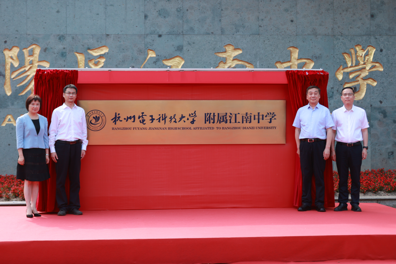 在全体与会人员的共同见证下,吴卿、詹艳青、费国民、徐松泉为杭电附属江南中学校名揭幕,学校与江南中学之间的紧密合作关系将进一步巩固和深化,也象征着双方在数字科技教育领域的崭新起点和美好未来。今后,学校将继续深化与永兴教育集团的合作,共同探索大中小科学教育一体化的崭新模式。