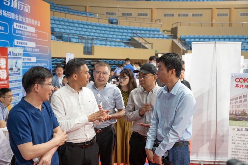 浙江省经信厅企业服务体系建设处处长劳俊华、浙江省教育厅高等教育处正处级干部蓝邓骏、钱塘区人社局副局长颜燕炯等在我校党委副书记戚明钧以及学校招生就业处负责人的陪同下来到招聘会现场指导工作。劳俊华强调,专精特新中小企业具备专业化、精细化、特色化特征,创新能力强,成长性较好,特别需要青年大学生人才为企业的快速发展注入新鲜活力。蓝邓骏表示,就业是最基本的民生,要瞄准各专业毕业生的就业问题,提供精细化就业服务,加强学校、毕业生、用人单位之间的交流和供需对接,进一步引导毕业生到中小企业就业创业。戚明钧表示,学校将继续把优势学科和优质产业紧密衔接,积极对接浙江省“315”科技创新体系和“415X”先进制造业集群,进一步拓宽就业渠道,多措并举全力推动毕业生高质量充分就业。