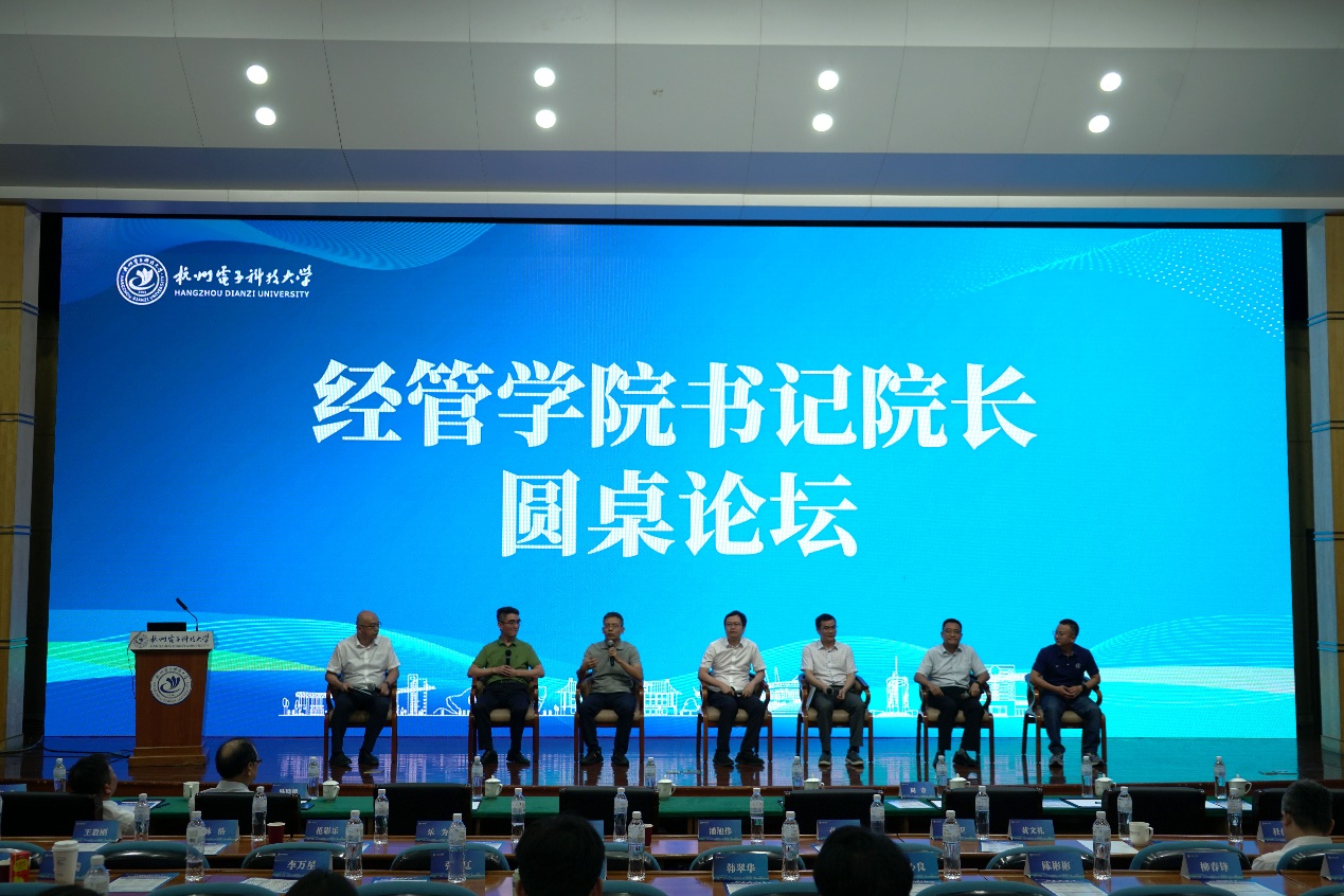 经管学院书记院长圆桌论坛围绕“新质生产力背景下数字化经管人才培养”的主题展开,杭电管理学院院长杨伟教授主持。浙江工业大学管理学院党委书记李正卫教授,浙江师范大学经济管理学院院长陈宇峰教授,浙江理工大学经济管理学院院长潘旭伟教授,浙江工商大学工商管理学院党委书记孙元教授,中国计量大学经济管理学院院长乐为教授,浙江财经大学金融学院党委书记黄文礼教授等就数字化技术在经济管理教育中的应用、如何培养适应新质生产力要求的人才、专业与课程改革等话题进行了热烈分享和讨论。
