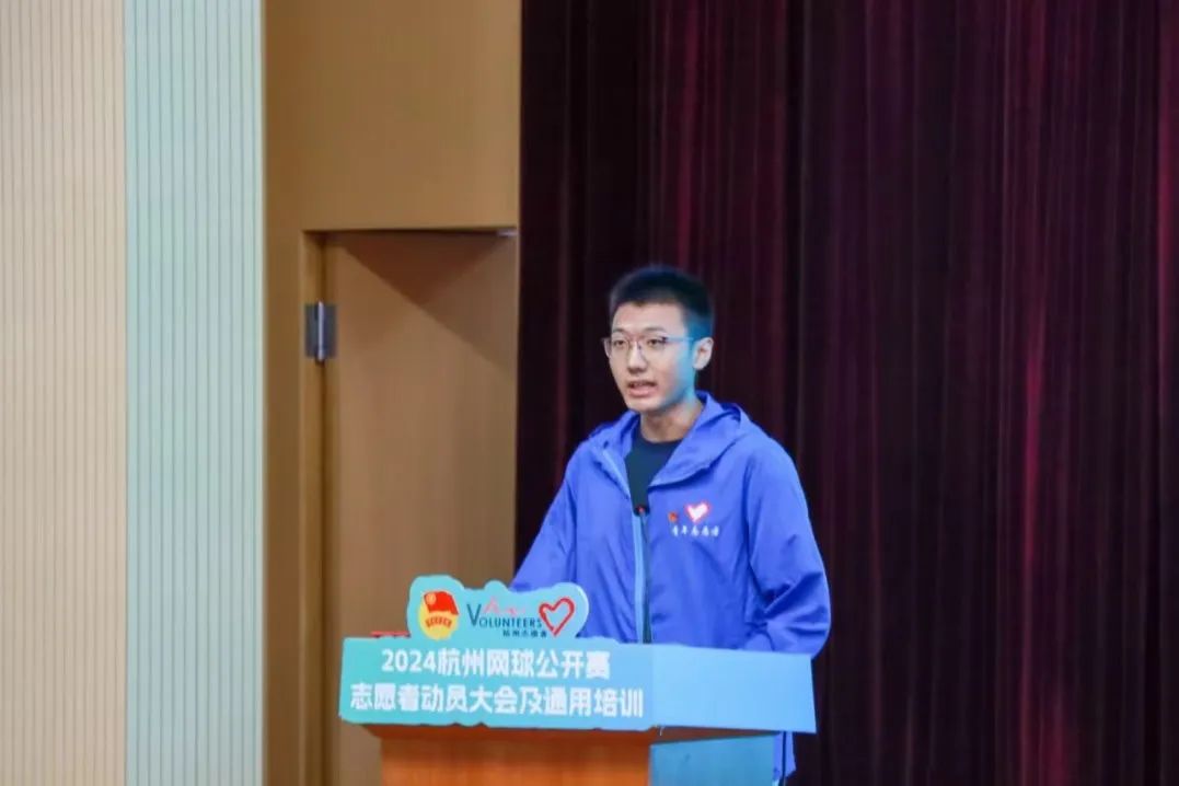 电子信息学院孟昭霖作为2024杭州网球公开赛的志愿者代表发言。他表示,作为肩负重任的志愿者,赛事前我们将参与岗前课程和培训,听从指挥和安排;赛事中用心倾听需求,耐心解答每一个疑问,确保自己能够为赛事提供足够专业、高效的服务,用行动诠释“奉献、友爱、互助、进步”的志愿精神。