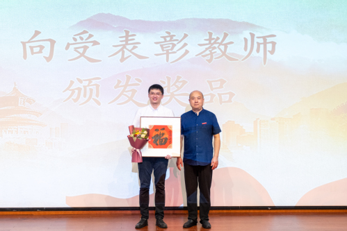 下午,书法佳作献园丁表彰慰问会在四教127举办。会上,吴一桥将中国书法家协会会员精心创作的书法精品赠送给一线优秀教师。不仅展现了中国书法的独特魅力,更寄托了对老师们宁静致远、品德高尚、学识渊博的美好祝愿。理学院新入职教师还获赠了由书法家书写的习近平总书记对高校教师提出的“三个四”要求座右铭牌,座右铭要求新教师忠诚党的教育事业,遵守教育法律法规,时刻铭记教书育人神圣使命,心有大我,潜心治学,立德修身,培根铸魂,引领学生健康成长,做到有理想信念、有道德情操、有扎实学识、有仁爱之心,为实现中华民族伟大复兴贡献力量。