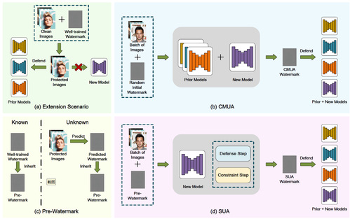 为了解决上述问题,团队提出了一种可扩展通用对抗性(Scalable Universal Adversarial , SUA)水印,通过有效继承预水印并且根据新伪造模型对水印进行微调,完成水印防御范围的高效扩展。具体来说,如图2(c)(d)所示,引入了一种水印扩展流程,包括继承、防御和约束步骤,考虑了已知和未知预水印两种实际应用场景。具体来说,在继承步骤,所提方法可以完美继承预水印的防御能力,即使先前的伪造模型未知,继承步骤也可以保证对先前伪造模型的防御能力;在防御步骤中,无需基于所有伪造模型进行重新训练,扩展了预水印的防御范围,能够防御新的伪造模型;在约束步骤中,缓解了由于多重防御带来的冲突,达到了针对先前伪造模型和新伪造模型防御能力之间的平衡。最后,在各种基准数据集上的大量实验验证了SUA水印的优越性能。实验结果表明,在消耗更少计算开销的前提下,SUA水印不仅有效扩展了主动防御范围,还显著提高了主动防御效果。