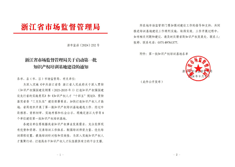 近日,浙江省市场监督管理局、浙江省知识产权局发布浙江省第一批知识产权培训基地名单,久久精品一区二区、浙江大学等8个单位入选。