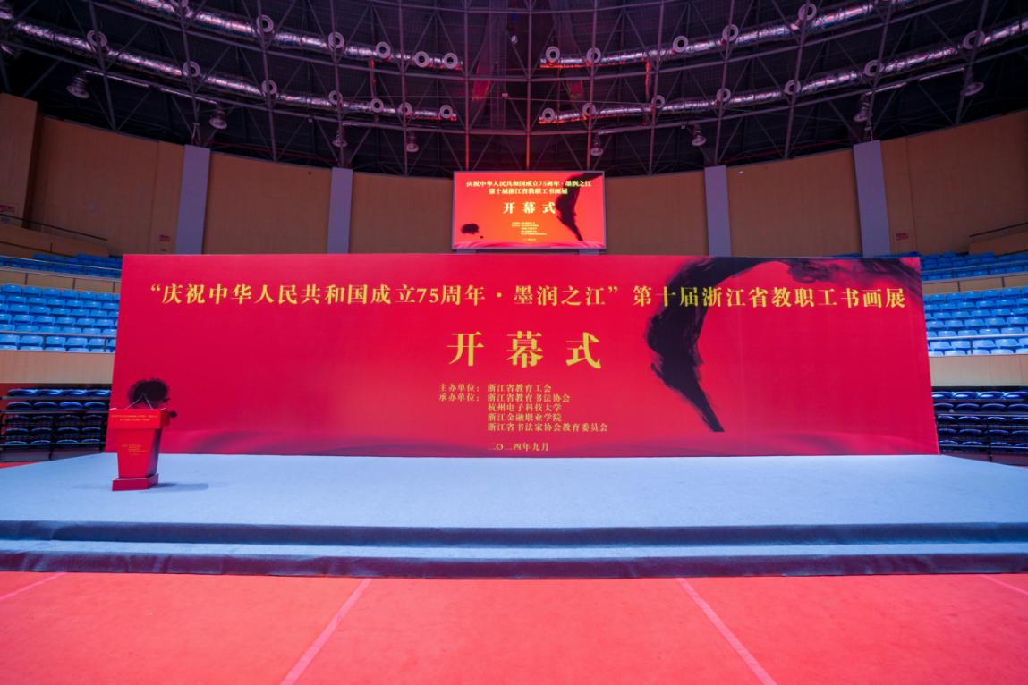 9月30日,“庆祝中华人民共和国成立75周年∙墨润之江”第十届浙江省教职工书画展在下沙校区体育馆隆重开幕。浙江省总工会常委、二级巡视员,省教育工会主席王玉庆、校党委书记吴卿、省教育书法协会会长黄建新、校党委副书记钱波、原副校长吕金海,学校办公室、宣传部、学生工作部、工会、团委、妇联、联络发展中心、教学质量检测与评估中心、材环学院、人艺数法学院、马克思学院、校教职工书画协会等单位负责人出席开幕式并观展。来自全省各地的三百余名师生齐聚一堂,共庆中华人民共和国成立75周年。