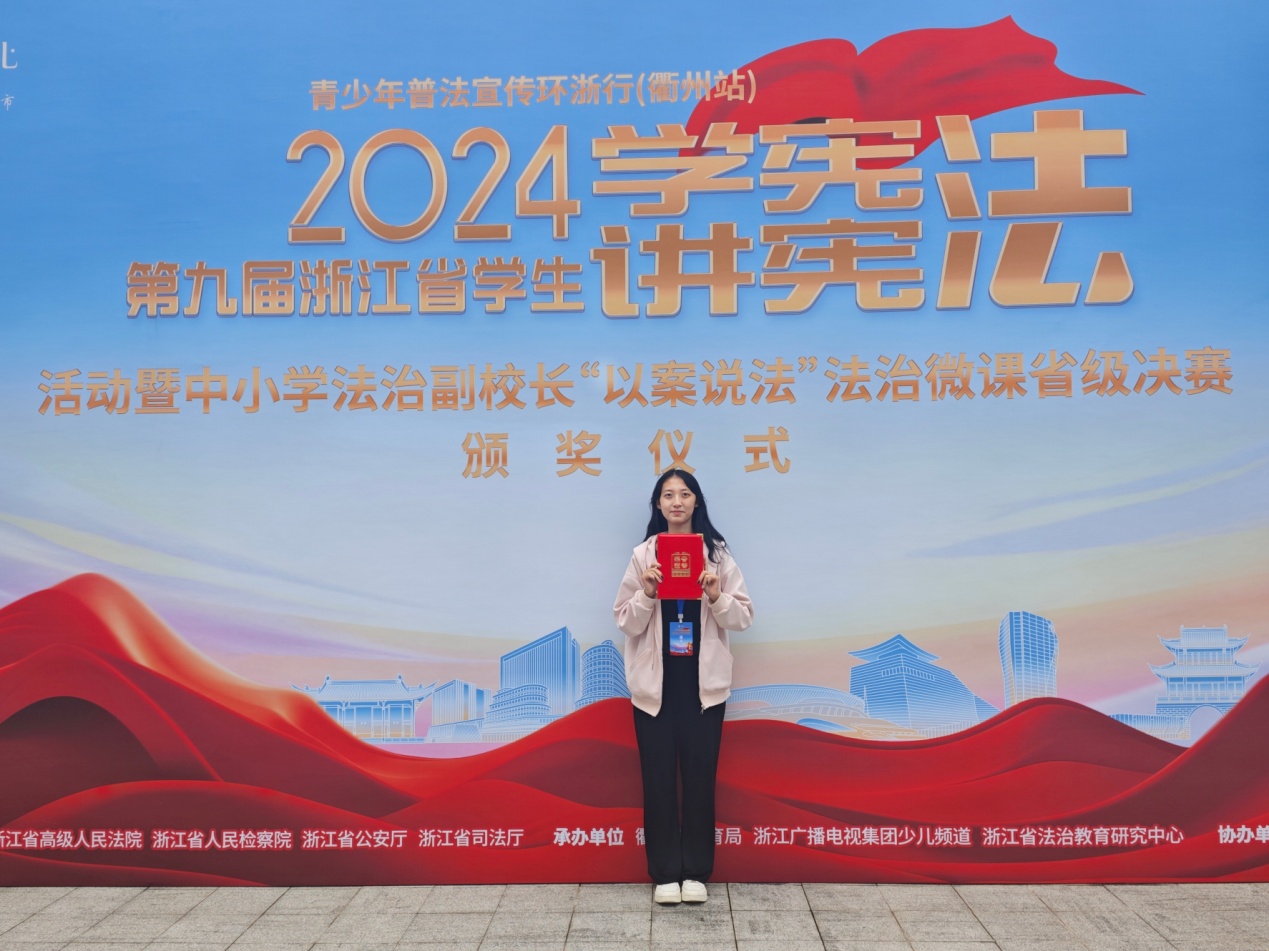 走进“宪”场聆听法治的声音!为贯彻落实党的二十届三中全会和全国教育大会精神,进一步贯彻落实习近平法治思想,推动宪法教育常态化发展。10月19-20日,浙江省教育厅、浙江省高级人民法院、浙江省人民检察院、浙江省公安厅、浙江省司法厅联合主办的第九届浙江省学生“学宪法 讲宪法”暨中小学法治副校长“以案说法”法治微课省级决赛展演在衢州顺利举行。我校人艺数法学院2023级法学生李博菲在刘晓峰老师的指导下,从初赛的42个高校脱颖而出,在决赛12名选手中表现优异,最终荣获省二等奖。