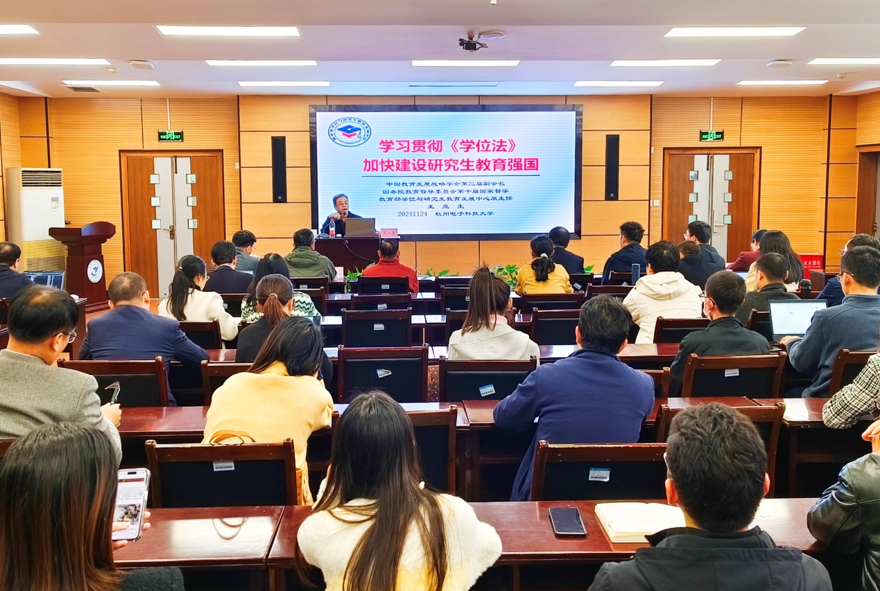 戚明钧代表学校对王立生受邀来校讲座表示欢迎和感谢。他指出,本次学位法的专题辅导报告,将帮助我们深入学习领会这项具有中国特色的学位法律制度,准确把握《学位法》所规定的具体法律内容,深刻理解《学位法》对于破解学位工作中存在问题的重要意义。学校将继续紧紧围绕立德树人根本任务,以“国家所需、未来所向、杭电所能”为工作理念,以面向国家重大战略和区域行业发展为需求导向,以电子信息特色鲜明的高水平研究型大学为建设目标,为建成教育强国战略目标贡献杭电力量。