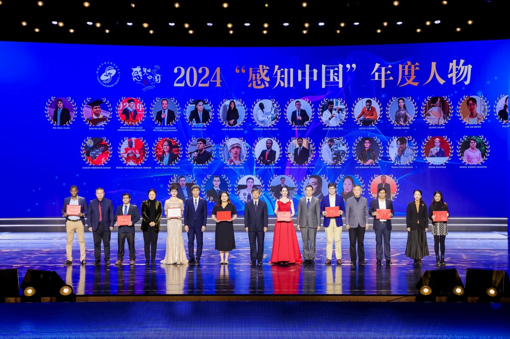 活动中,国家留学基金委党委书记、秘书长生建学、李文钧与其他嘉宾为2024“感知中国”年度人物学生代表颁发证书。