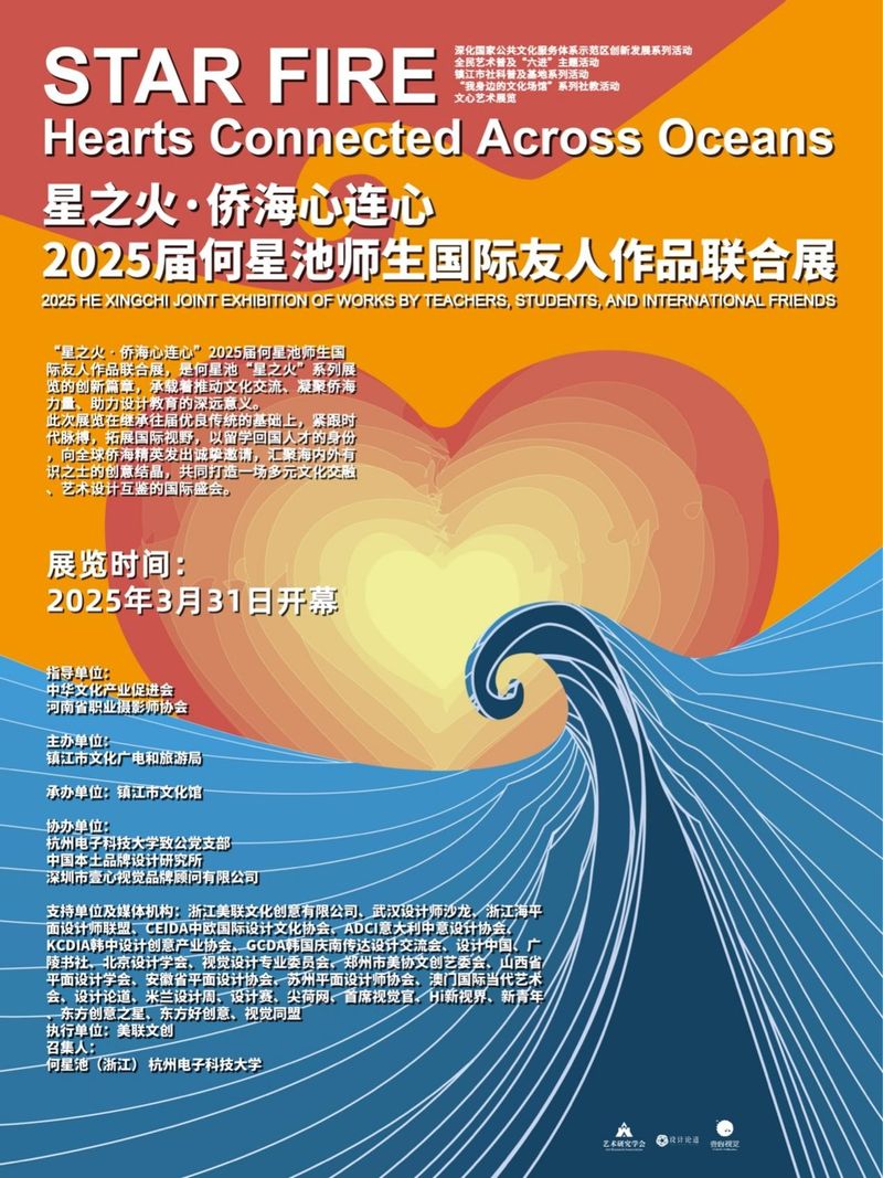 为进一步深化侨海人士统战工作,凝聚海内外创意智慧,展现中华文化开放包容的魅力,2025年3月31日,由我校致公党党员、欧美同学会、留联会会员何星池策划的“星之火·侨海心连心”——2025届何星池师生国际友人作品联合展在镇江市文化馆开幕。展览由镇江市文化广电和旅游局主办,镇江市文化馆承办,致公党久久精品一区二区支部、中国本土品牌设计研究所等单位协办,共展出侨海关系所在地杭州、镇江、湖州、金华、南通、太原、深圳、无锡、扬州、澳门、台湾、德国、韩国、荷兰、乌克兰、伊拉克等16个地区的100余件作品。