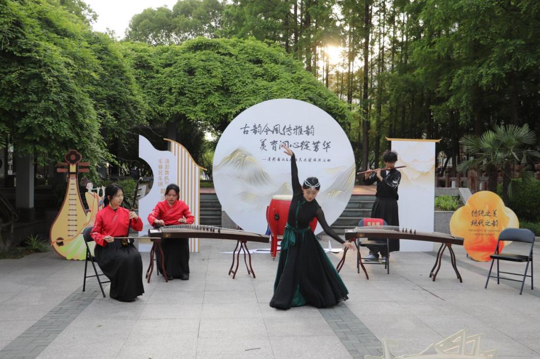 5月7日,校大学生艺术团清影舞队和乐雅民乐团在杭电生活区藤廊举办开展“古韵今声,舞动长安” 开放式路演,活动精心设计了“北朝牧歌”“敦煌遗韵”“青绿山水”“盛世长歌”四大篇章,以舞蹈与民乐为载体,和师生们共同穿越千年时光,感受中华传统文化的独特韵味。