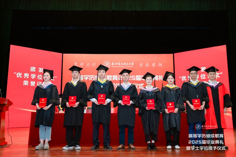 典礼结束后,毕业生们齐聚会场门口,在毕业展板前留念、合影打卡,为他们在杭电的求学之路画上圆满句号。本次毕业典礼还采用图片直播方式,未能返校的同学也在“云端”共享荣光时刻。