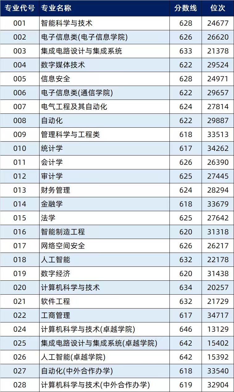 在我校普通类招生的27个专业(类)中,计算机科学与技术(卓越学院)(646分)、人工智能(卓越学院)(642分)、集成电路设计与集成系统(卓越学院)(642分)、计算机科学与技术(634分)、集成电路设计与集成系统(633分)、软件工程(632分)、人工智能(632分)、智能科学与技术(628分)、信息安全(628分)、网络空间安全(626分)、电子信息类(电子信息学院)(626分)、审计学(625分)、电气工程及其自动化(624分)、财务管理(624分)、数字媒体技术(622分)、智能制造工程(620分)、数字经济(620分)等17个专业(类)的投档分数线均位列省属同类高校相同或相近专业第一。同时,杭电圣光机联合学院的中外合作办学专业(计算机科学与技术、自动化)录取最低分为618分,位居省属同类高校的中外合作办学同类专业第一。