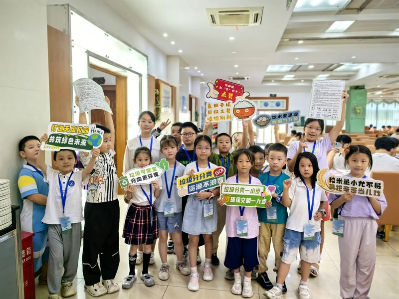 暑期班围绕生态环保、文化传承、科技创新等主题,设计了“垃圾分类”“光盘行动”“美食厨房”等特色实践课程。在垃圾分类活动中,孩子们通过实物分类游戏理解环保责任,将绿色理念根植于心;“光盘行动”则以日常用餐为载体,引导孩子们珍惜粮食、敬畏自然,并面向师生开展光盘行动、无废校园活动宣讲、签名活动。此外,孩子们还化身“生态小使者”,通过绘画、手工等创意活动传递环保信念,成为校园绿色风尚的引领者。