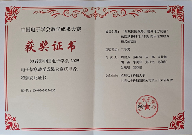二等奖成果为学院与中国电子科技集团公司第三十六研究所联合完成的《“聚焦国防战略,服务地方发展”的院所协同电子信息类研究生培养模式的实践》。该成果聚焦通信与信息对抗行业需求,构建了以“服务国家战略需求”为根本导向、“院所协同育人机制”为制度保障、“资源共享互补”为基础支撑的“三协同、四整合、五衔接”创新育人模式。依托国家实验室“电磁空间安全”和省工程研究中心“智能信息处理硬件”等高水平平台,双方共同打造了7门校企课程,获批5个省级研究生联合培养基地,通过项目化、阶段式的产教育人路径,在学位点建设和高水平成果产出上成效显著,培养的毕业生已在国防科技领域发挥骨干作用。